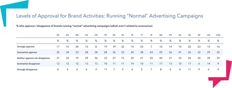 Ozbiljne kompanije i brendovi ne rade napamet, već vrlo pažljivo analiziraju situaciju i svoje marketinške aktivnosti kako na društvenim mrežama, tako i generalno, koncipirajući ih u odnosu na sveže uvide koje dobijaju sa tržišta. Global Web Index je napravio jedno sveobuhvatno istraživanje na tržištima koja su najviše pogođena virusom kovid-19 i rezultati pokazuju da ljudi većinom podržavaju marketinške aktivnosti brendova.