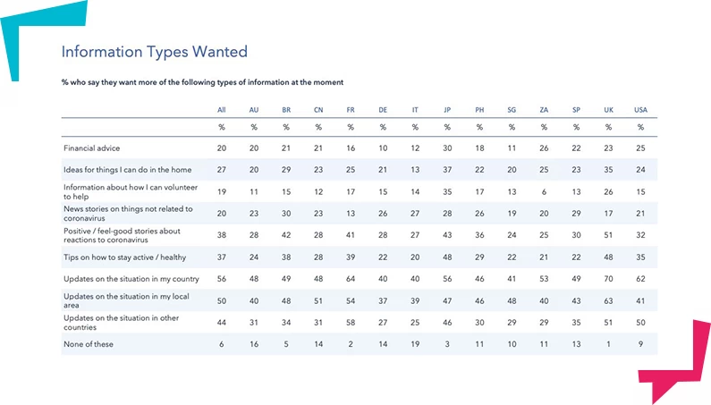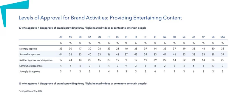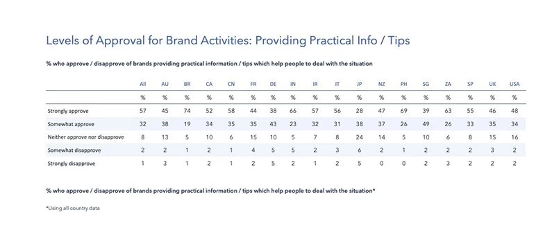 Što se tiče sadržaja, očigledno je da ljudima prija sadržaj zabavnog karaktera, a sa njim i saveti koji im pomažu da se izbore sa situacijom. Pomalo iznenađujuće je da čak odobravaju i komuniciranje benefita i loyalty programa. Takođe, otkriveno je da potrošači u velikoj meri podržavaju preusmeravanje osnovnih funkcija biznisa u smeru proizvodnje neophodnih namirnica.