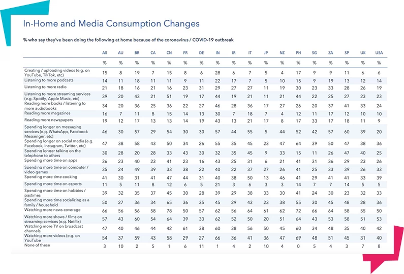 Isto istraživanje pokazuje da se među top aktivnostima, pored socijalizacije sa ukućanima, gledanja TV-a i kuvanja, nalaze i aktivnosti na društvenim mrežama i chat platformama.