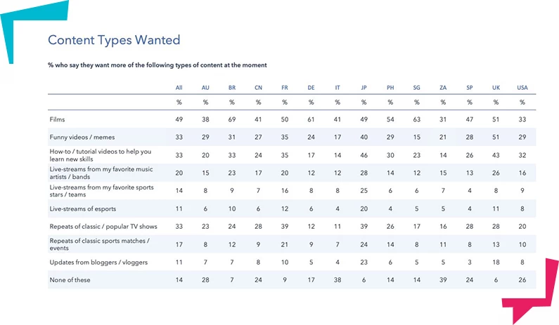 Što se forme sadržaja tiče, video je i dalje neprikosnoveni kralj: filmovi i serije su #1, a nakon toga idu smešni, „how to“, i „uradi sam” (DIY) video klipovi.