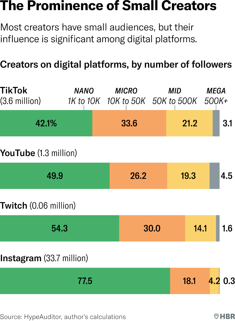Ono što je zaista izvanredno je istaknutost manjih kreatora. Kada pomislimo na kreatore, često pomislimo na mega-influencere poput Kardašijanki. Ali realnost je da su značajna većina kreatora ono što je poznato kao „nano“ ili „mikro“ kreatori. Reč je o kreatorima koji imaju manje od deset, odnosno pedeset hiljada pratilaca. Nano i mikro kreatori čine 76% svih kreatora na TikTok-u i čak 96% na Instagramu, prateći dinamičku karakteristiku digitalnih platformi po zakonu moći. Mi tvrdimo da su ovi manji stvaraoci ti koji podstiču razorne sile ekonomije kreatora.