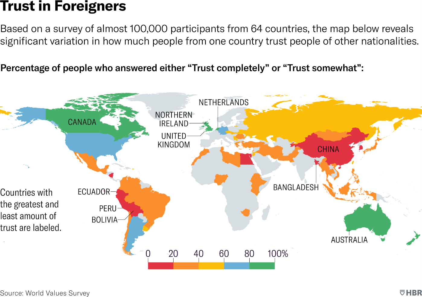 Kulture se veoma razlikuju po tome koliko veruju stranim partnerima. U Sjedinjenim Državama ovo poverenje je relativno visoko. U nedavnom globalnom istraživanju koje je pitalo ljude koliko veruju ljudima iz stranih zemalja, 75% Amerikanaca je navelo ili „donekle” ili „potpuno”, dok je to učinilo samo 17% Kineza. Kao što mapa ispod pokazuje, poverenje u strane nacije obično je mnogo veće u razvijenim zapadnim zemljama nego u drugim svetskim regionima. U zemljama u kojima je poverenje u strane nacije nisko, uključivanje lokalnih partnera je ključno za uspostavljanje uporišta.