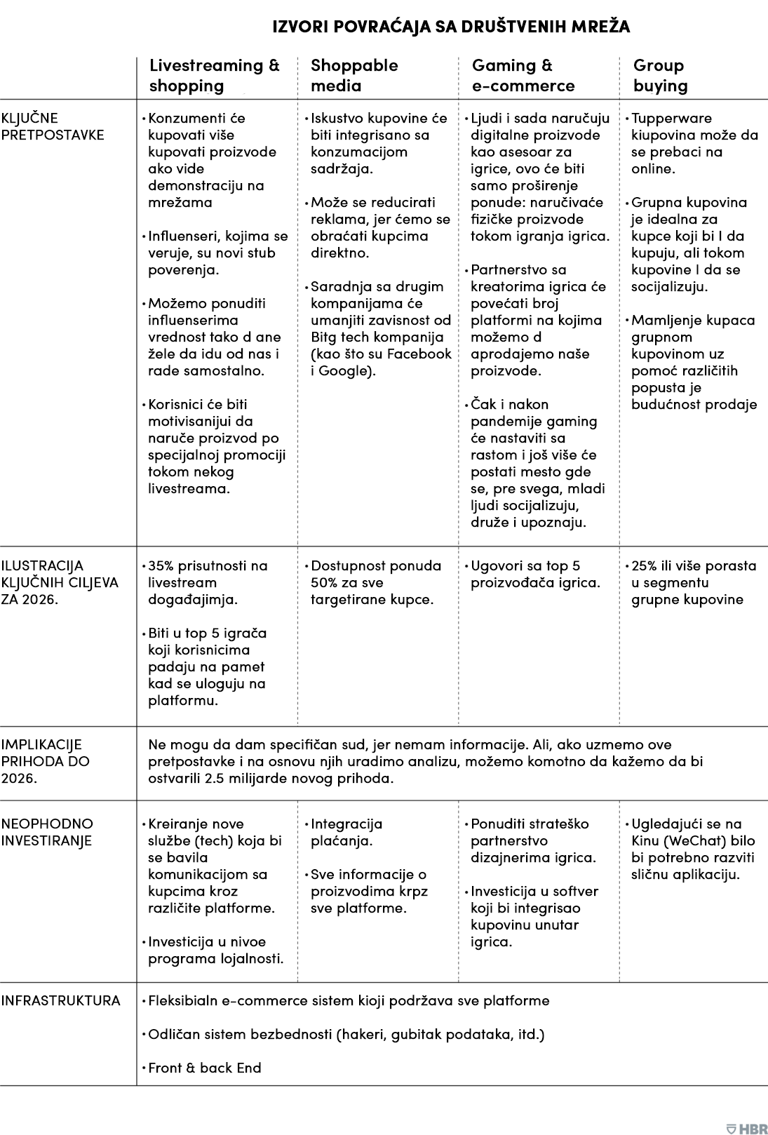 Jasno je da je jedan od ciljeva ove strategije da se upozna sa kupcima tamo gde jesu — što sve više nije u konvencionalnim maloprodajnim objektima za vrstu proizvoda koje Unilever prodaje. Zaista, Seb Džozef izveštava za Digidai da je 8% ukupne prodaje Unilevera u 2020. dolazilo iz kanala e-trgovine, za razliku od 6% prethodne godine. Ako shvatimo da će do trenutka kada strategija bude zrela, neka vrsta e-trgovine predstavljati 10% prodaje Odeljenja, što podrazumeva investicije za privlačenje oko 2,5 milijardi dolara potrošačke potrošnje onih koji se bave društvenim aktivnostima u kombinaciji sa trgovinom.
