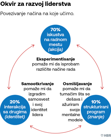 Tradicionalni razvoj liderstva nam govori da se 70% učenja dešava kroz iskustvo na poslu, 20% kroz povratne informacije, a 10% kroz formalnu obuku. Istraživanja sprovedena u poslednje tri godine ukazuju na alternativni — i, verujemo, efikasniji — okvir za proces koji naglašava tri akcije: stvaranje smisla ili razumevanje kako poslovni svet i organizacija funkcionišu oko vas; eksperimentisanje ili testiranje ideja; i samootkrivanje, ili otkrivanje sopstvenog identiteta na radnom mestu. Kada je implementiran u HSBC, ovaj okvir je poboljšao razvoj učesnika. Eksperiment je takođe ukazao na nove najbolje prakse za hibridni razvoj liderstva: programi treba da budu iterativni i eksperimentalni, ugrađeni u svakodnevni rad, podržani obukom i obuhvataju sve načine isporuke od potpuno virtuelnih do potpuno ličnih.