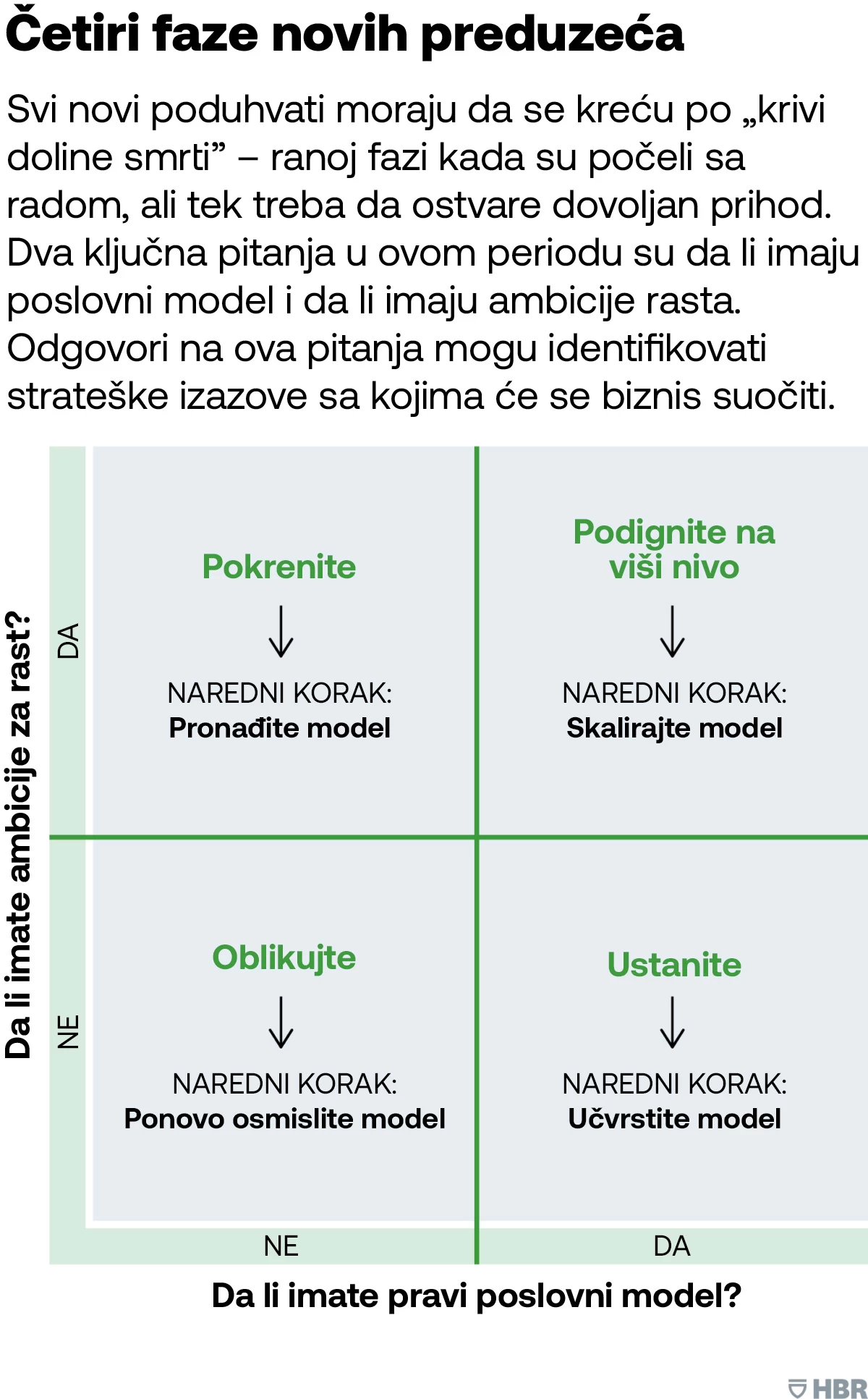 Kada zacrtamo uspeh poslovnog modela i ambicije rasta na matrici, možemo da identifikujemo četiri faze novih preduzeća: pokretanje, odlazak na viši nivo, oblikovanje, ustajanje. Svaki od njih dolazi sa strateškim izazovima.