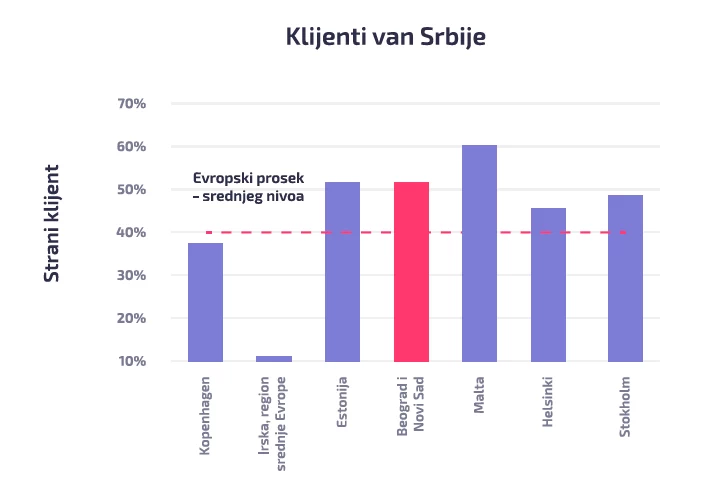 Kada pričamo o dosegu globalnog tržišta, više od polovine startapa u Beogradu i Novom Sadu kao većinu svojih kupaca imaju one koji su izvan Srbije. Međutim, autori skreću pažnju na to da postoji prostor za unapređenje u pogledu globalnih ambicija.